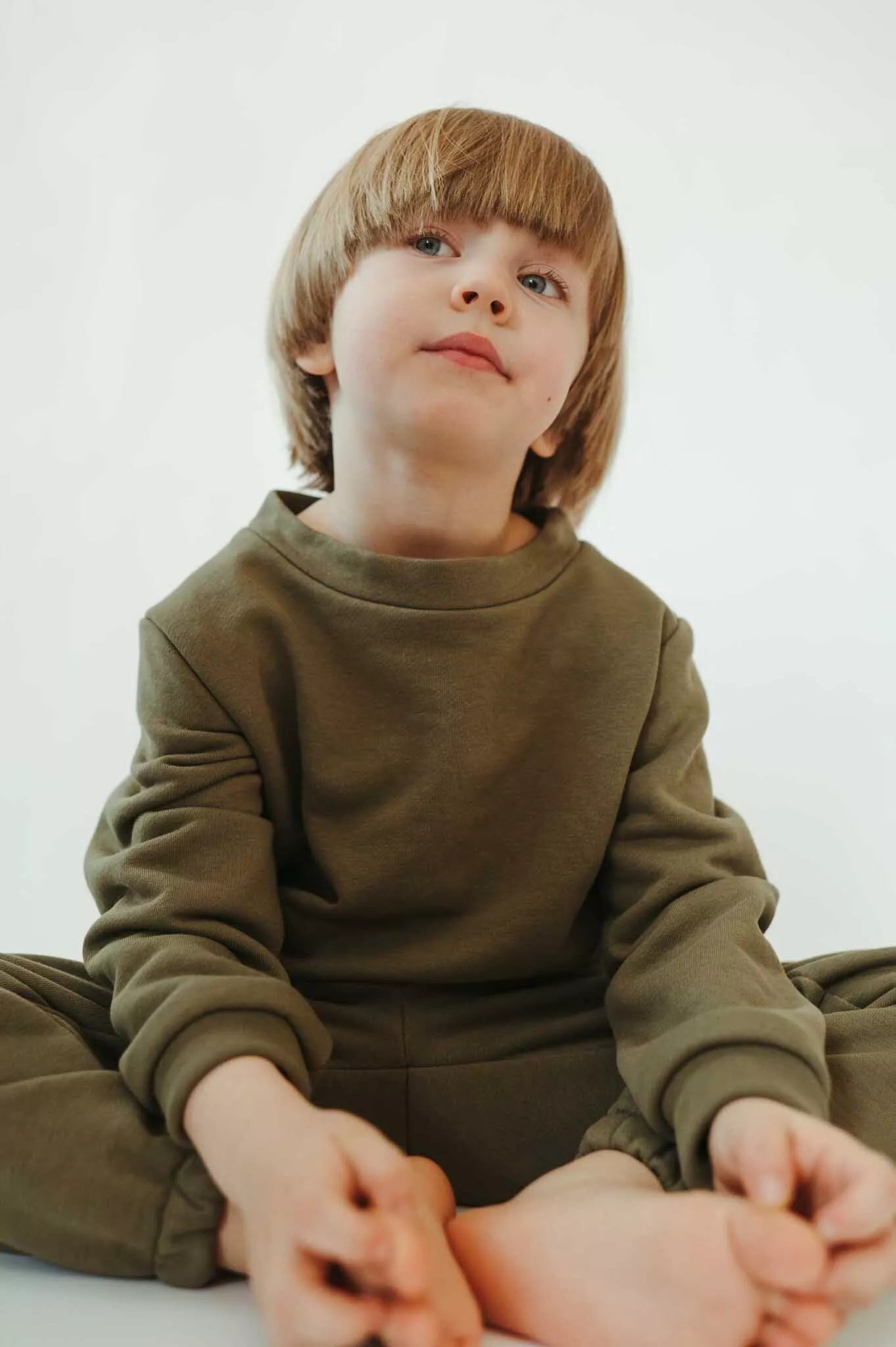 Sofa Killer samanų spalvos vaikiškas lininis kostiumėlis su kelnėmis