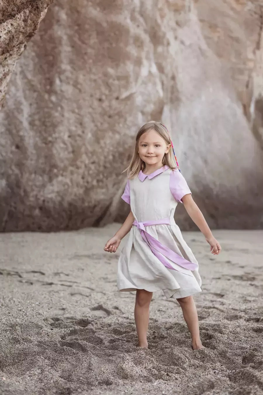 Sofa Killer smėlio spalvos vaikiška lininė suknelė su violetine apykakle