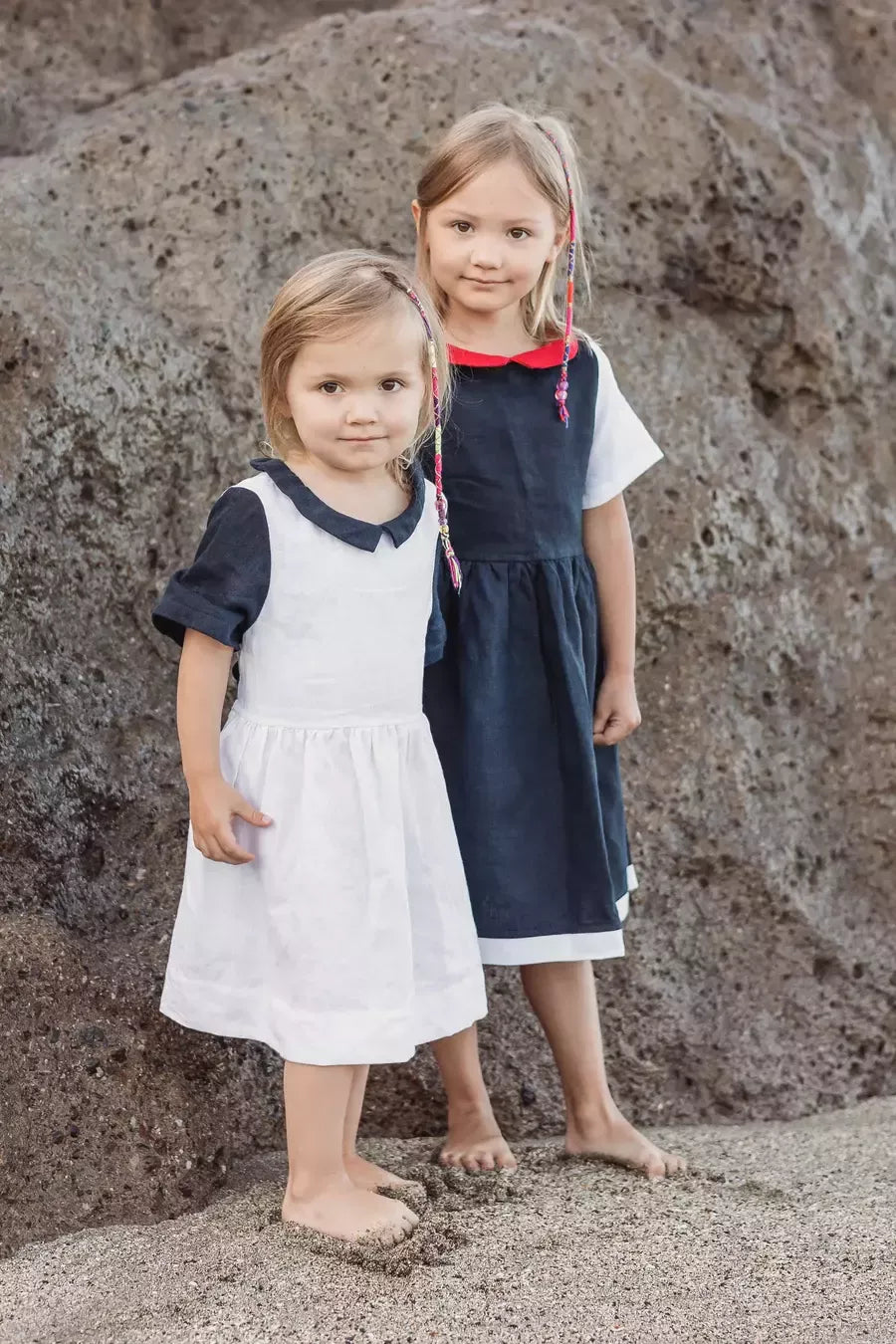 Sofa Killer tamsiai mėlynos spalvos vaikiška lininė suknelė su raudona apykakle
